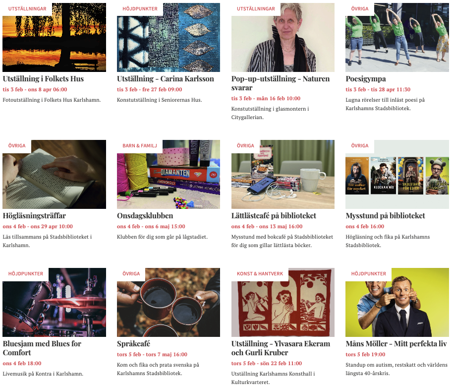 Visit Karlshamns evenemangskatalog finns nu även på gillakarlshamn.se. Det ger ditt evenemang ännu större räckvidd och gör Karlshamns kulturutbud synligt för fler. Skicka in ditt evenemang redan i dag. Smart, va?